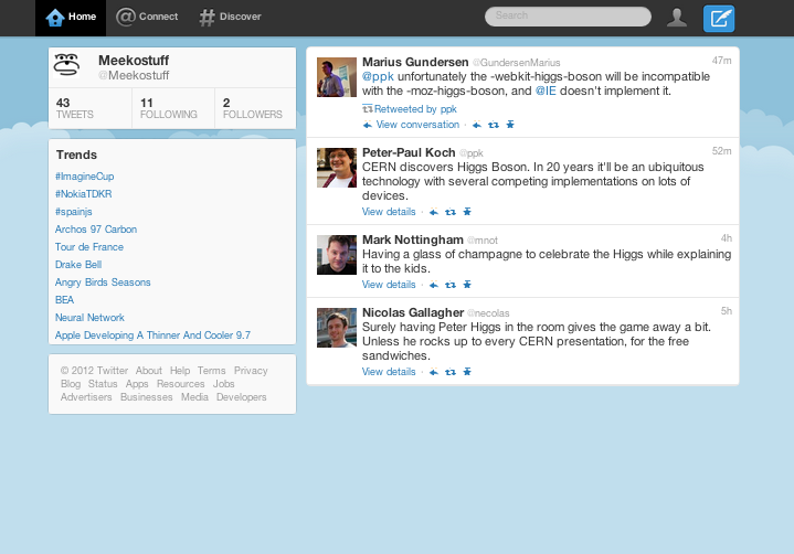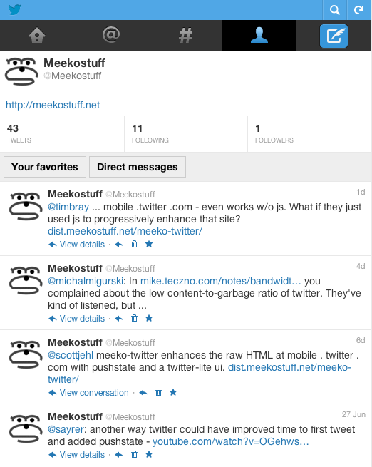 Obviously this would be automatic if this approach was built into the site. This is the primary reason Internet Explorer is not supported. - meeko-twitter uses CORS XMLHttpRequest to load the page-template (although this could be worked around by a JSON-P approach). This is the secondary reason Internet-Explorer isn't supported.