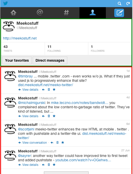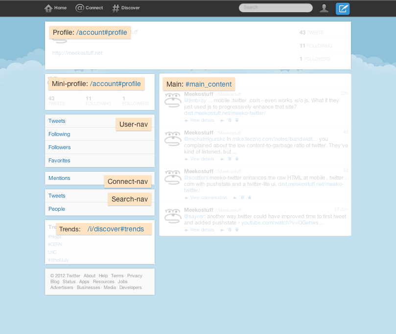 pushStatesupport. (This blog also relies on HTMLDecor, so browse around to see what it's like when built into a site.) - meeko-twitter DOES NOT necessarily require